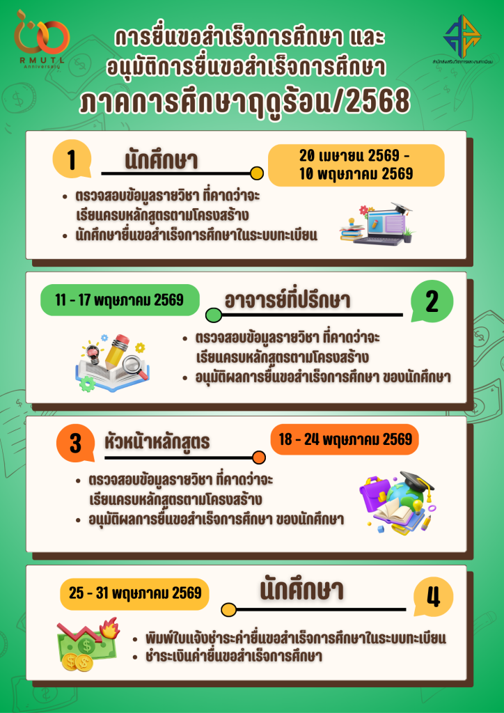 1.นักศึกษาทุกระดับ ที่คาดว่าจะเรียนครบหลักสูตรตามโครงสร้าง ให้แจ้งขอยื่นสำเร็จการศึกษาในระบบทะเบียน เมนู S08 20 เมษายน 2569 - 10 พฤษภาคม 2569